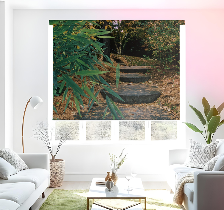 Enhance the appearance of your windows with this unique design that incorporates natural elements. The 3D forest and small road roller blind allows you to modify the look of your windows effortlessly. Its lovely landscape aesthetic not only adds charm but also allows you to control the amount of light entering your rooms at any given time. The installation process is made simple with the provided instructions. This design features a detailed forest corridor with stone steps adorned with beautiful yellow flowers. Transform your living room with this exquisite forest landscape roller blind, available in various sizes.