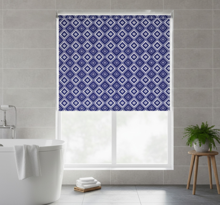 Reference: E8998Transform your space with our Blue blind with blue diamond pattern, a stunning combination of elegance and functionality. The intricate blue diamond pattern adds a touch of sophistication while ensuring your room is beautifully adorned. This roller blind offers easy assembly in just 2 clicks, making it a breeze to enhance your decor! Additionally, it provides privacy when lowered and protects your room from direct sunlight, allowing for a comfortable atmosphere.