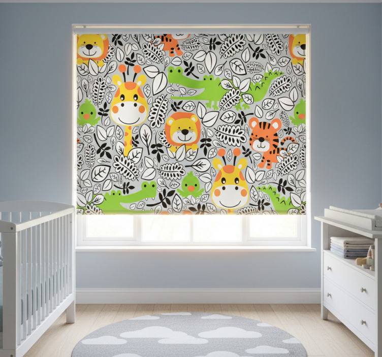 The Childrens blind jungle friends grey childrens blind is an ideal decorative element that enhances any child's bedroom. With its fun jungle theme, it not only adds a pop of creativity but also creates a warm and inviting environment. This roller blind transforms the room into a jungle adventure, inspiring joy and imagination in your little ones!