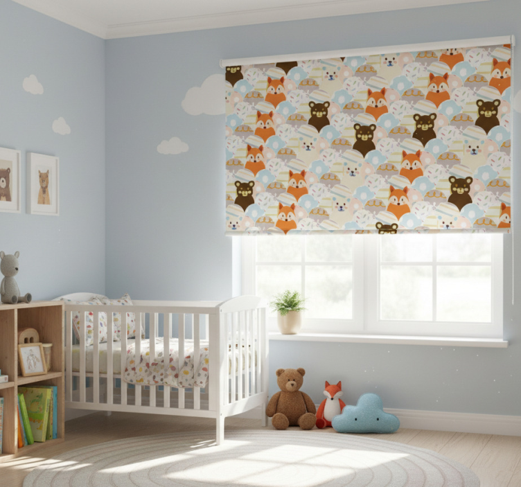 Reference: E6876Introducing our delightful Childrens blind with patchwork bear and fox design, a charming addition to any child's room! This enchanting design features playful illustrations of a cuddly bear and a mischievous fox amidst a colorful patchwork pattern. The vibrant colors and adorable characters create a whimsical atmosphere that sparks joy and imagination, making it perfect for your little one's space!