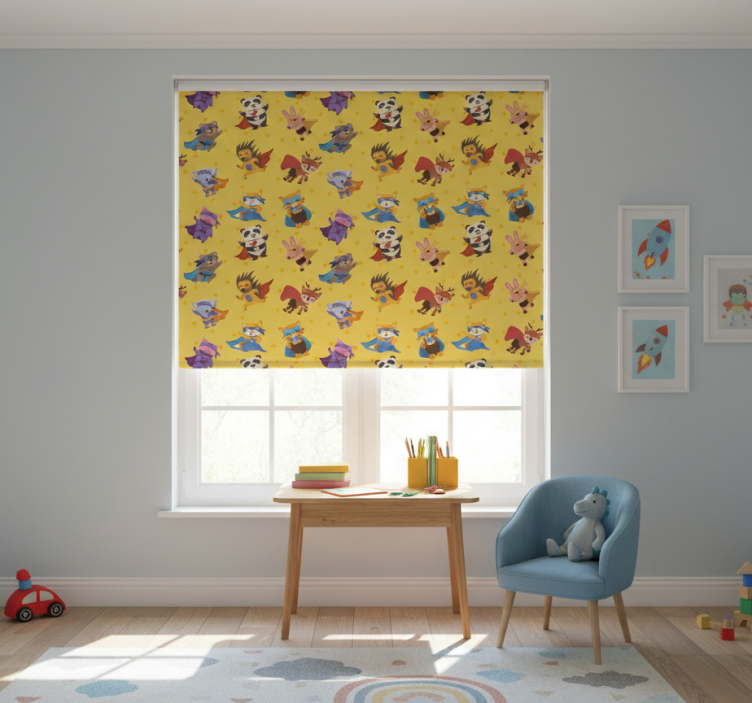 Reference: E6895Introducing our vibrant Childrens blind with superhero pets pattern on yellow, a delightful addition to any child’s room! This stunning design features adorable superhero pets in a bright yellow backdrop, creating a cheerful atmosphere that is both playful and inviting. The colorful patterns are sure to spark joy and imagination, making it the perfect choice for a child's space.