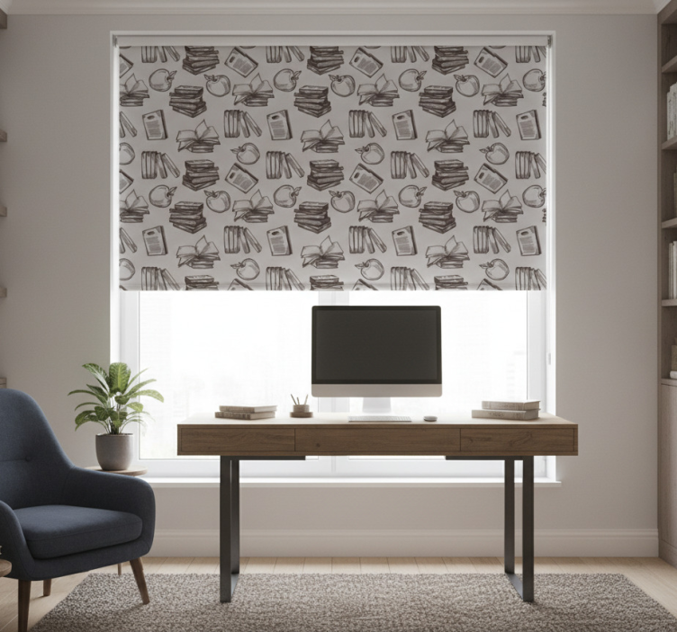 Reference: E6230Introducing our Home office blind with vintage study elements, a charming fusion of classic aesthetics and modern functionality! This roller blind features easy assembly in just two clicks, a selection of three exquisite textures tailored for your desired light and privacy, and a practical chain mechanism for effortless operation. It's not just about looks; it provides essential benefits such as sun protection, privacy when lowered, and regulation of room temperature, all while enhancing your home’s decor!
