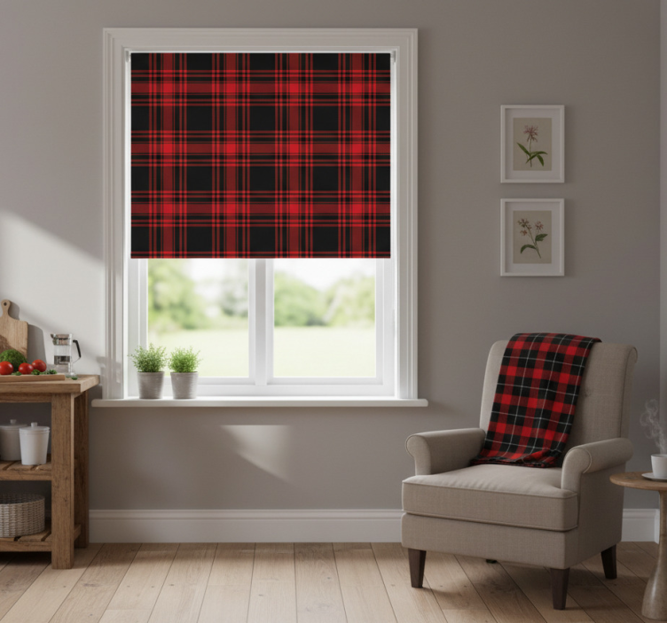 The Kitchen blind in menzies tartan black red check kitchen blind serves as a stunning focal point for your home decor! Its vibrant colors and classic design bring warmth and character to any room. By incorporating this beautiful roller blind into your space, you can effortlessly enhance your decor while enjoying the practical benefits of light control and privacy. Transform your kitchen into a cozy haven with this exquisite blind!