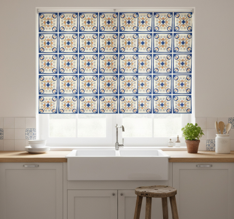 Reference: E6393Introducing our stunning Kitchen blind with pink flowers portuguese tile, a beautiful blend of elegance and functionality! This unique design features delicate pink flowers set against a classic Portuguese tile backdrop, creating a vibrant and inviting atmosphere in any kitchen. The intricate patterns and soft colors bring warmth and charm, making it the perfect addition to your home decor.