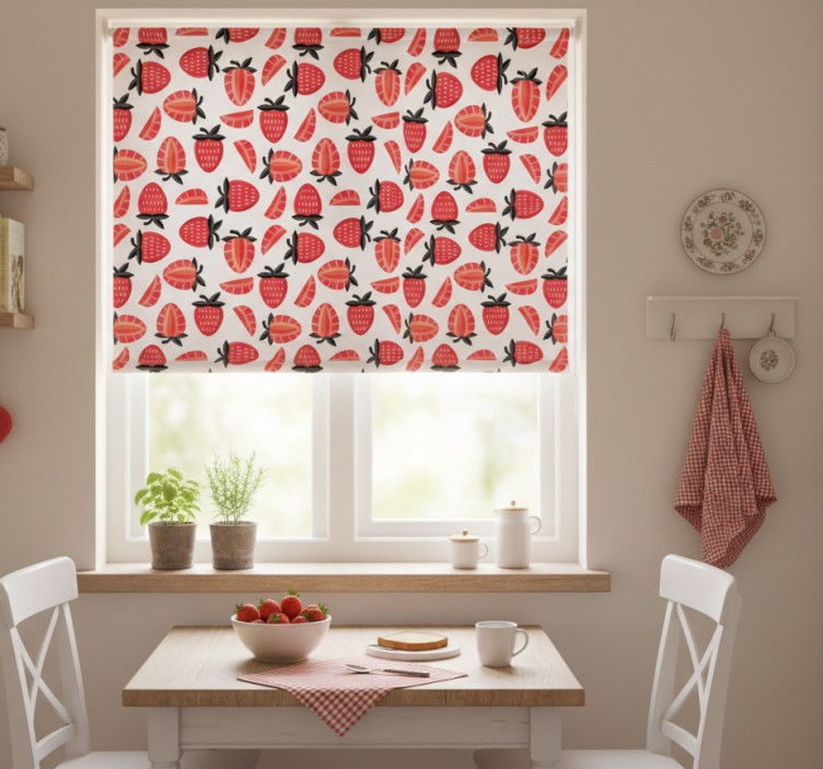 Reference: E6422Transform your space with our stunning Kitchen blind with realistic red strawberry pattern, featuring a vibrant design that brings the essence of nature indoors. This delightful roller blind showcases a beautiful array of luscious red strawberries, set against a crisp white background, creating a cheerful and inviting atmosphere. The design not only enhances the visual appeal of your kitchen but also offers practical benefits, such as easy cleaning and effective light regulation.