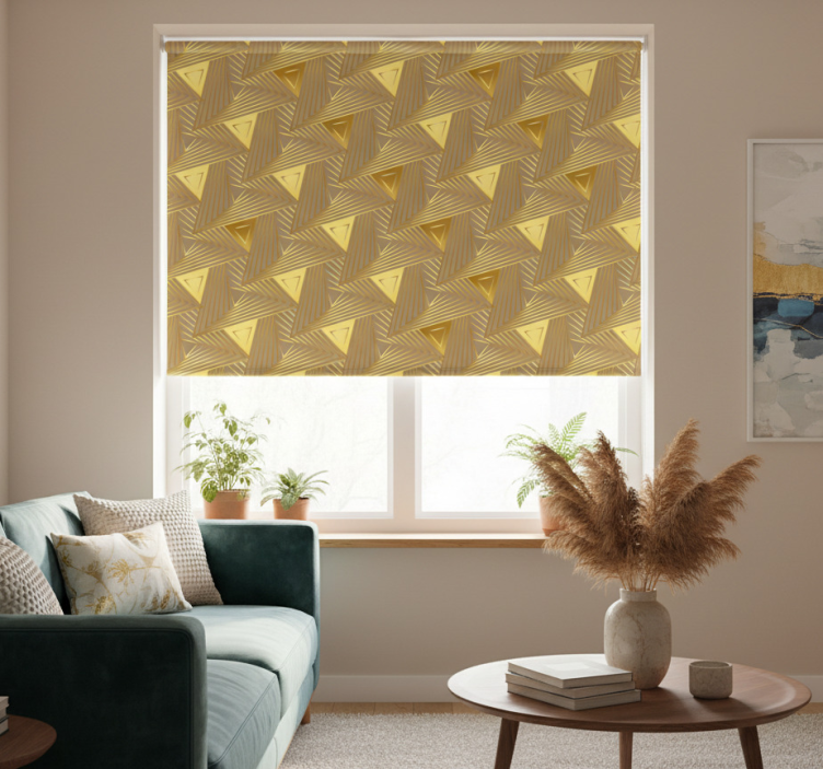 Reference: E7694The Modern blind eclectic golden geometric design is a stunning visual masterpiece that combines contemporary aesthetics with timeless elegance. Featuring intricate golden geometric patterns, this design is perfect for those looking to enhance their space with a touch of sophistication. With its easy assembly in 2 clicks, easy to clean materials, and the ability to regulate room temperature, this blind not only beautifies your home but also adds functionality and comfort. It protects your room from direct sunlight, provides privacy when lowered, and ensures security by allowing you to see without being seen!