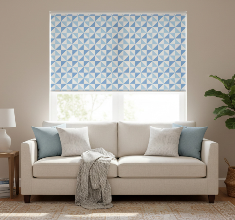 Reference: E7779Introducing our stunning Modern blind light blue triangle pattern, a beautiful fusion of contemporary design and functionality! This roller blind features a captivating light blue triangle pattern that adds a touch of elegance to any space. With easy assembly in just two clicks, effortless cleaning, and the ability to protect your room from direct sunlight, this modern blind is perfect for enhancing your home décor while providing privacy and security.