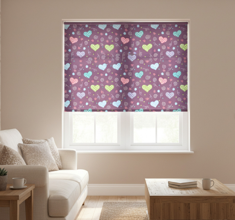Reference: E7632Transform your living space with our Modern blind pattern-decor hearts and lines, a visually captivating design that combines playful hearts and sleek lines. This unique roller blind not only enhances your interior decor but also offers practical features such as easy assembly in just 2 clicks, easy cleaning, and quick disassembly, making it a perfect addition to any room!