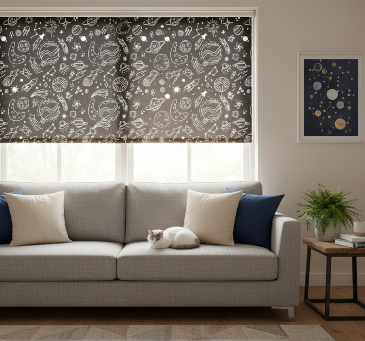 Modern blind with black and white cosmic art