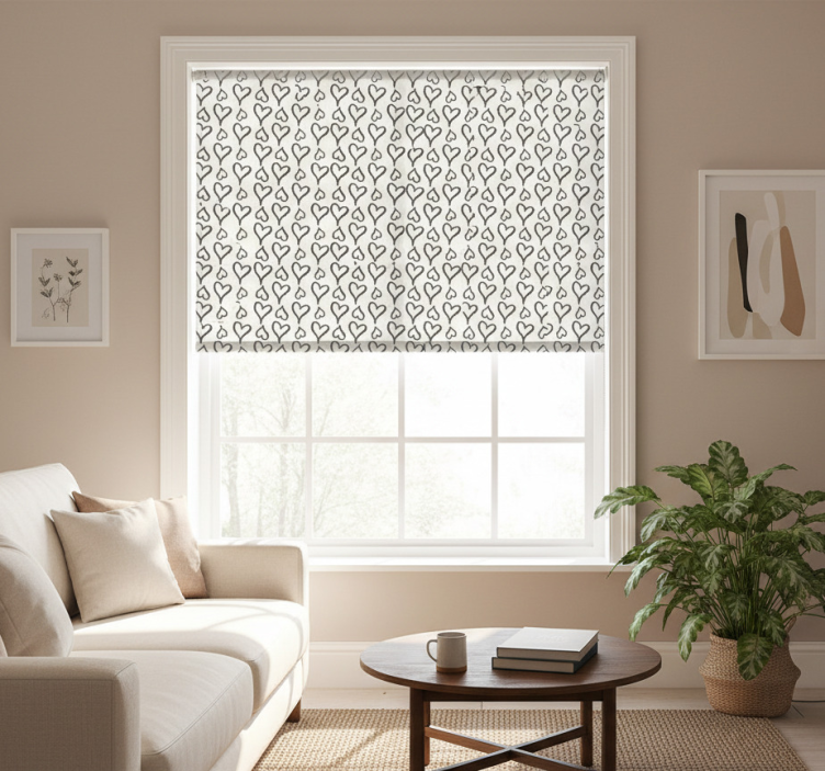 The Modern blind with black illustrated heart icons modern blind is a fantastic choice for anyone looking to elevate their home decor! Its unique design not only beautifies any room but also serves practical purposes, making it a perfect addition to your living space. Imagine transforming your windows with this delightful blind, creating a warm and inviting atmosphere that reflects your personality. With its charming motifs, this roller blind brings joy and style, making it an ideal decorative piece for any room!