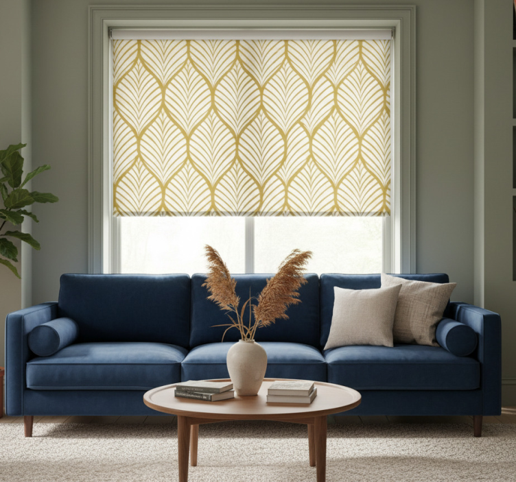 Reference: E9072Introducing our Modern blind with golden geometric leaf design, a stunning addition to any home decor! This unique roller blind features an eye-catching golden geometric leaf pattern that beautifully complements a wide range of interior styles. With its easy assembly in 2 clicks and easy disassembly in 2 clicks, cleaning your windows has never been simpler. Not only does it protect your room from direct sunlight, but it also provides privacy when lowered, allowing you to enjoy your space without interruption. The Modern blind with golden geometric leaf design is designed to help regulate room temperature, enhancing your comfort while adding a touch of elegance to your decor.