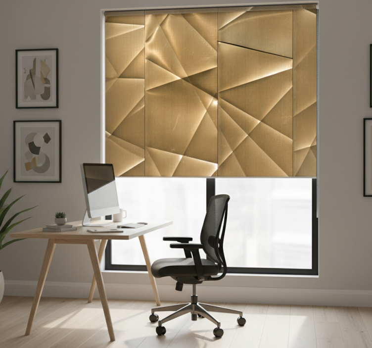 The Office blind 3d golden polygon design Office blind is more than just a window covering; it’s a statement piece that enhances the overall ambiance of your office. Imagine the impression it will create on your clients and colleagues alike! This roller blind elevates your workspace by introducing a contemporary flair, making it the perfect choice for anyone looking to inspire creativity and productivity in their environment. Transform your office into a stylish haven with this breathtaking design!