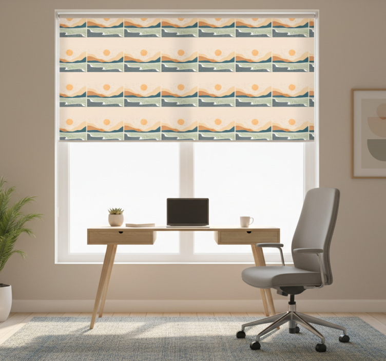 The Office blind abstract sunset mountains Office blind is more than just a window covering; it is an inspiring piece of art that elevates the ambiance of any office space. Imagine a workspace filled with energy and creativity, where the stunning abstract portrayal of mountains and sunsets motivates you every day! This roller blind not only transforms your room's décor but also acts as a shield against harsh sunlight, creating a serene atmosphere conducive to productivity!