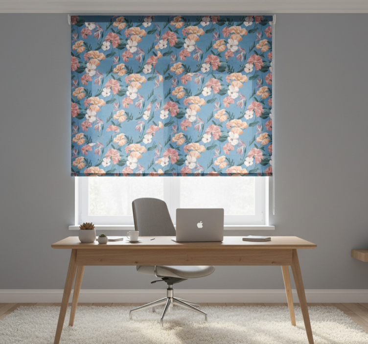 The Office blind flowerprint 'flower jeans' Office blind is a fantastic choice for anyone seeking to elevate their interior decor. This enchanting floral design brings a touch of nature indoors, creating a warm and inviting atmosphere. Imagine the compliments from your colleagues as they admire your stylish choice that not only decorates but also protects your space from harsh sunlight. Let your office bloom with personality and charm!
