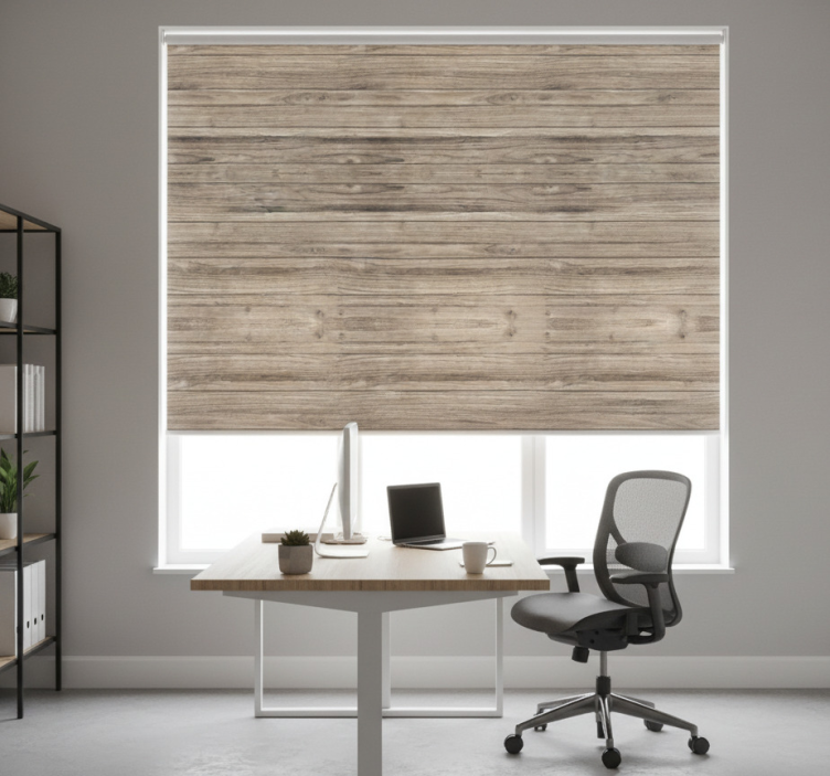 Reference: E7370Transform your space with our Office blind gray rustic horizontal wood planks, an exquisite choice for any room! Featuring a stunning gray tone with rustic horizontal wood planks, this design effortlessly combines elegance and functionality. The natural texture adds warmth to your decor while ensuring that you maintain a cozy atmosphere. Easy to clean and assemble in just two clicks, this roller blind is perfect for enhancing your home or office.