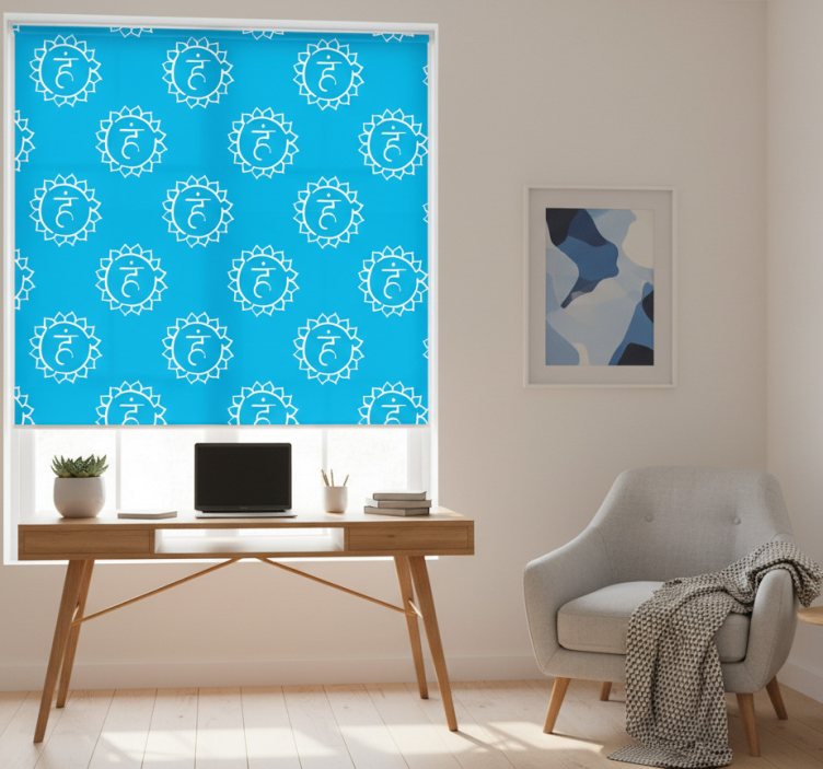 Reference: E7344Transform your workspace with our stunning Office blind throat chakra design! This unique roller blind features an eye-catching chakra motif that harmonizes with your environment, adding a touch of elegance and spirituality to your office. The design not only captivates the eye but also infuses your space with positive energy, making it an inspiring addition to any room. With easy assembly in just two clicks, simple cleaning, and the ability to customize measurements, this office blind is perfect for enhancing your decor.