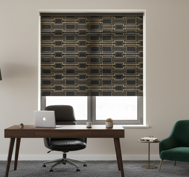 The Office blind with gold frame art decor pattern Office blind transforms your workspace into a chic environment that inspires productivity. Its unique design adds a touch of personality to your office, while providing functionality and comfort. Imagine working in a space that reflects your style while offering privacy and light control—this roller blind does just that, making it an essential addition to your decor!