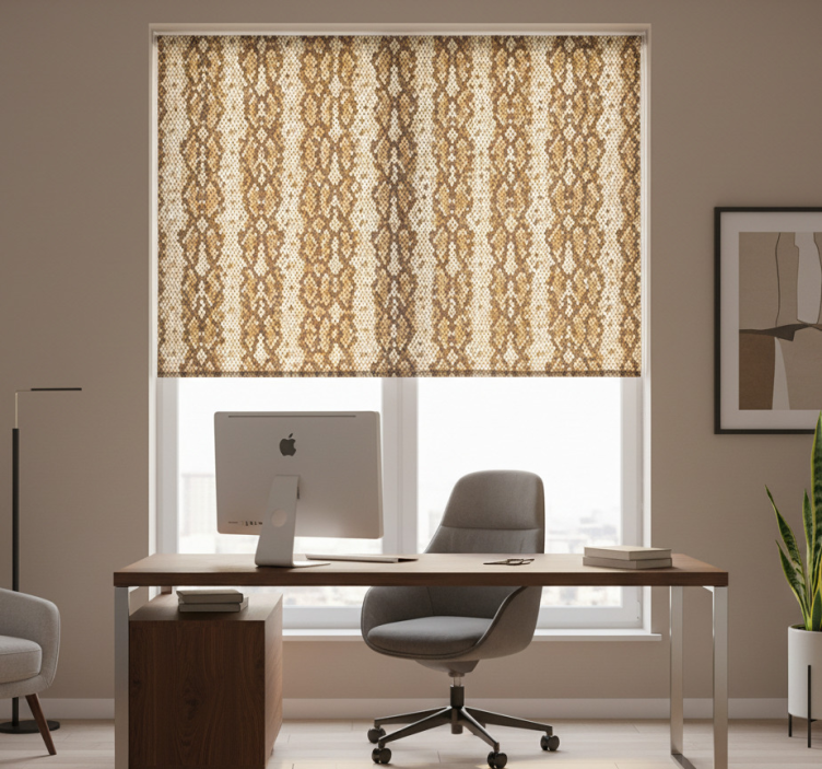 Reference: E7318Introducing our stunning Office blind with snake skin design, a perfect blend of elegance and functionality! This unique roller blind features a captivating snake skin pattern that adds a touch of sophistication to any workspace. With easy assembly in just 2 clicks, this blind is designed for effortless installation. Cleaning is a breeze, as it allows for quick disassembly, ensuring your windows and surroundings stay spotless. Not only does it protect your room from direct sunlight, but it also provides essential privacy when lowered, allowing you to enjoy your space freely. The Office blind with snake skin design can help regulate room temperature and offers a sense of security, allowing you to observe without being seen. Plus, it improves the overall decoration of your room, making it a must-have for any stylish office.