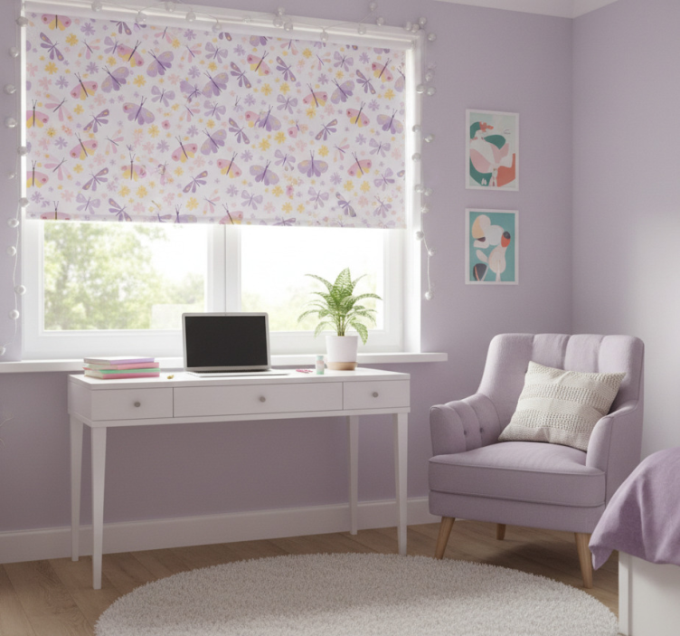 Reference: E7442Transform your space with our Teenage roller blind with purple butterfly design, a stunning addition that brings a magical touch to any room! This delightful roller blind features vibrant purple butterflies dancing across a soft background, creating a cheerful atmosphere that's perfect for any teenager's bedroom. The design not only captivates the eye but also enhances the overall decor, making it a charming focal point. Each blind is crafted for easy assembly and disassembly in just 2 clicks, ensuring that maintaining cleanliness is a breeze. Additionally, it provides privacy when lowered and effectively protects the room from direct sunlight, allowing for a comfortable living environment.