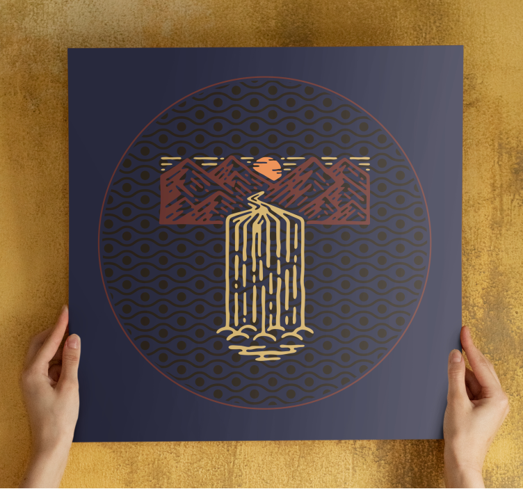 Experience the beauty of nature with our Landscape canvas serene waterfall scene. This stunning design features a mesmerizing waterfall cascading down majestic mountains under the warm glow of a sunset. The artwork is adorned with shades of purple, arranged in a geometric pattern that creates a minimalist drawing, embodying an African-inspired abstract style. The circular elements bring a sense of harmony and tranquility, making it a perfect representation of nature's splendor.
