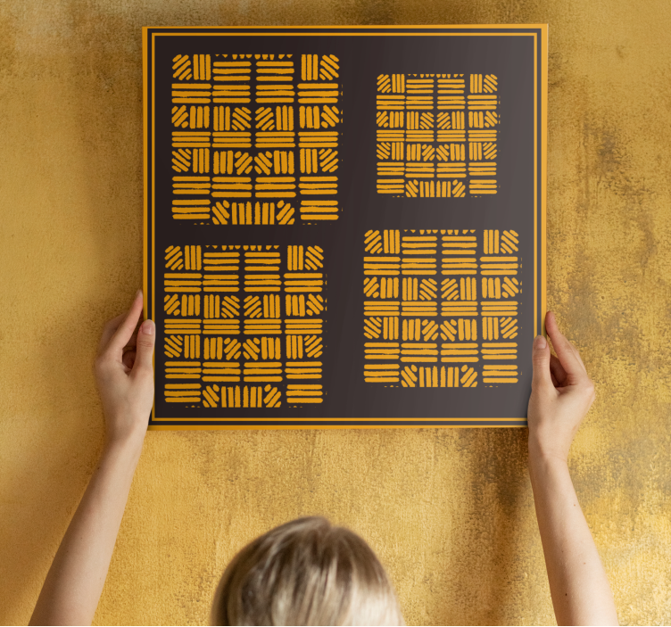 Indulge in the captivating beauty of our Modern canvas art geometric design arrangement, a stunning representation of contemporary artistry. This piece features a harmonious blend of african influences with striking gold and yellow tones, beautifully intertwined with lines and shapes that create an abstract visual delight. The framed artwork is designed with a meticulous geometric grid, making it a perfect addition to any modern space.