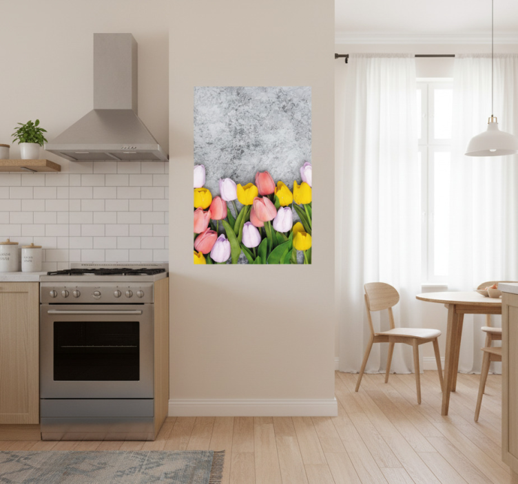 Reference: G635Introducing our stunning Kitchen poster featuring similar tulip flowers, a captivating design that brings the beauty of nature into your home! This exquisite piece showcases vibrant tulip flowers in varying shades, creating a harmonious blend of color that will brighten any space. Crafted with a 180g/m2 grammage, this poster is ideal for decoration, featuring a semi-matt finish that eliminates reflections while ensuring high color intensity.