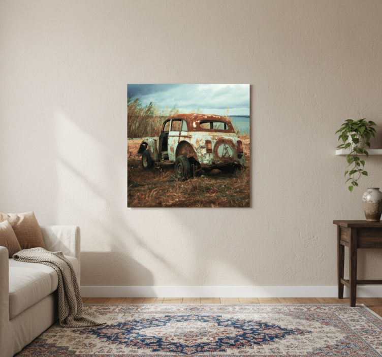 Reference: G801Transform your living space with our stunning Living room poster of a weathered car in the fields. This beautifully designed poster features a captivating image of a rustic car set against the backdrop of open fields, evoking a sense of nostalgia and adventure. With a 180g/m2 grammage that is ideal for posters and a semi-matt finish without reflections, this artwork showcases high colour intensity, making it a perfect centerpiece for any room.