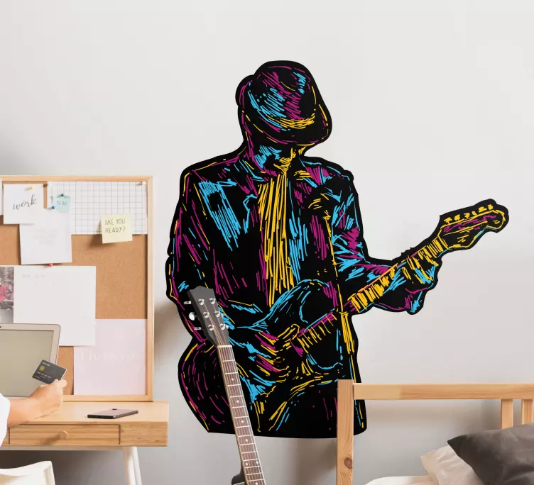 Get this design and enjoy all the different elements that you can use to customise the look of your house. This product is great to get for the bedroom of your teenage kid that loves music. This is more than just a simple decoration. Get it now and enjoy all the different elements. The design has a guitar player with yellow, blue, and purple traces. This product is easy to apply and it doesn't need any kind of specialized equipment. This