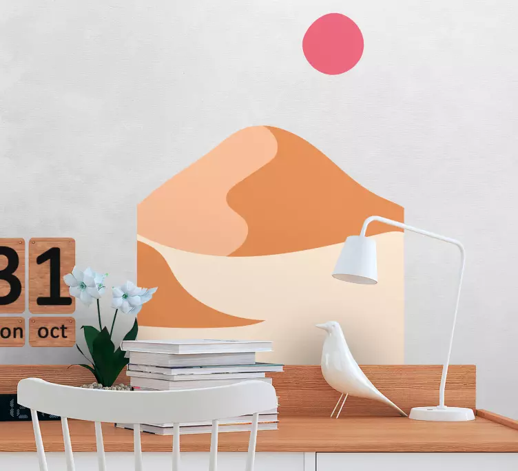 Transform your space with our stunning Abstract sand dunes decoration wall sticker. This unique design features majestic mountains and a radiant sun set against a backdrop of abstract sand dunes, beautifully capturing the essence of nature in a minimalist style. Perfect for those who appreciate a blend of artistry and tranquility, this wall sticker adds a serene touch to any room!