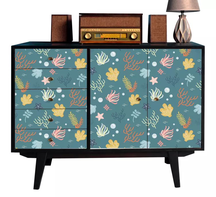 This cool furniture sticker features an illustration of undersea corals and other underwater life on a soft background. It adds a lovely touch to any furniture space. The application is easy, and it can be easily removed when desired.