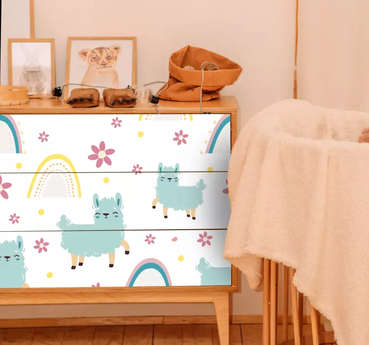 Introducing our Charming llama concept sticker, a delightful illustration that brings a playful touch to any space! Featuring adorable llamas intertwined with colorful flowers and vibrant rainbows, this sticker is designed to brighten up your furniture and create a joyful atmosphere. The graphic pattern is drawn with care, showcasing a whimsical vibe that will surely capture the hearts of all who see it!