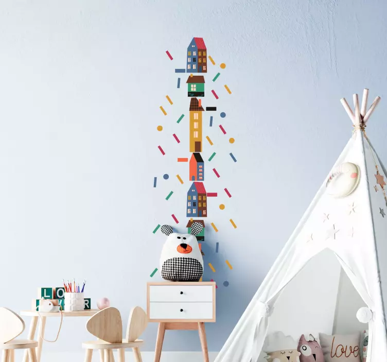 The design features a vertical arrangement of houses decorated with confetti ornaments, making it perfect as a height chart and decoration idea for a child's bedroom. The decal is highly adhesive and made with premium quality vinyl, ensuring that it can be removed anytime without leaving any residue on the surface.