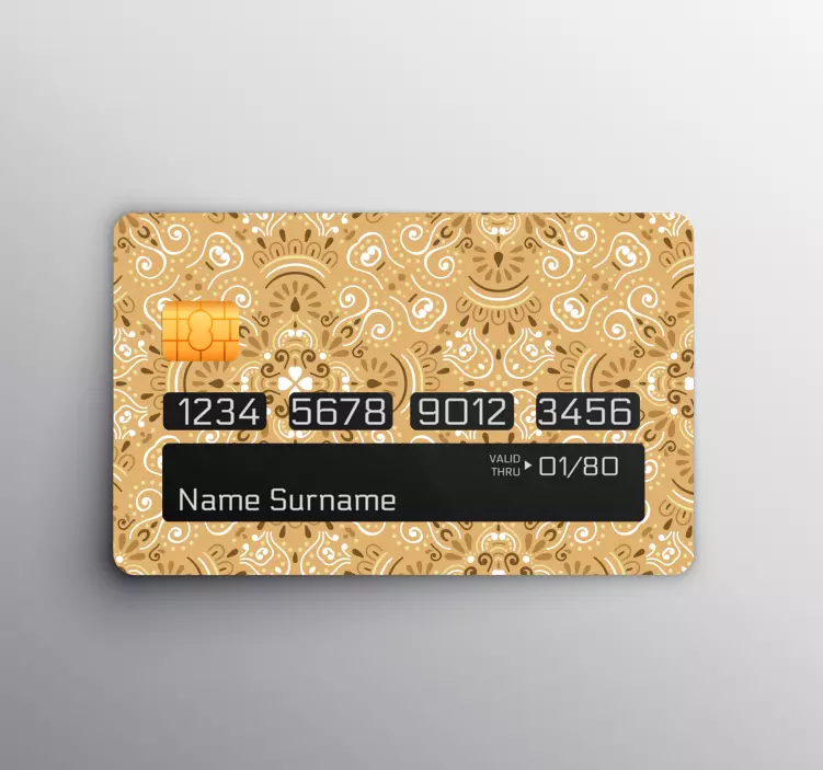 Introducing our Credit card sticker ornate card design! This exquisite sticker features a beige background adorned with intricate ornamental patterns, making it a perfect blend of elegance and style. Its decorative design transforms any credit card into a fashionable accessory, adding a touch of sophistication to your everyday transactions.