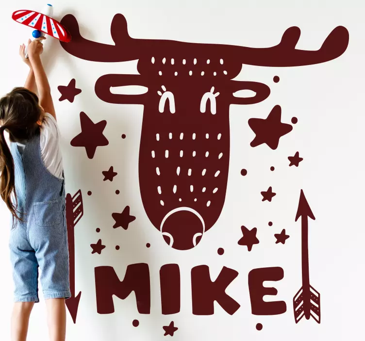 Introducing our enchanting Customisable sticker whimsical deer face, a delightful design that features a playful reindeer adorned with nordic elements, stars, and an arrow, creating a charming atmosphere perfect for children's spaces. This personalizable sticker allows for the inclusion of your child's name, making it a unique addition to any room!