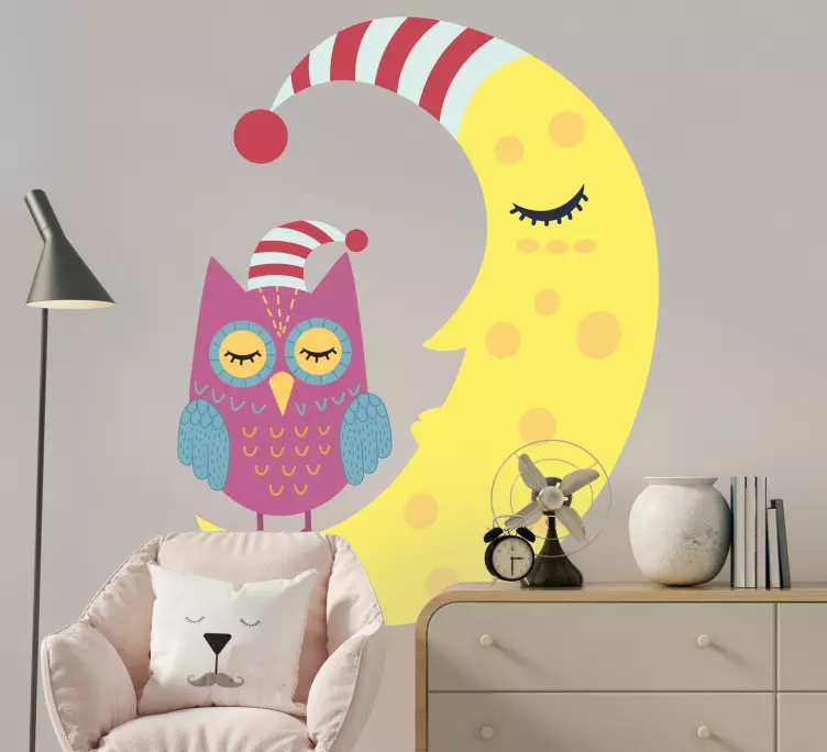Transform your child's room into a whimsical dreamland with the Drowsy owl luna wall sticker for kids. This enchanting design features a cute cartoon owl peacefully sleeping amidst a colorful moonlit backdrop. Perfectly crafted for a children's room, this delightful wall sticker brings a touch of nighttime magic, ensuring that your little ones drift into sweet slumber surrounded by adorable imagery!