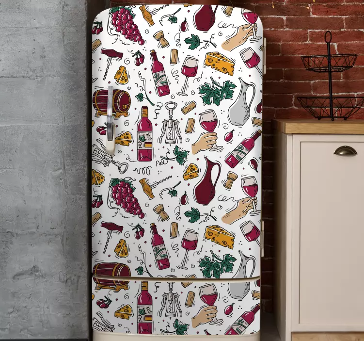 Introducing our Fridge sticker culinary delights design, a visually captivating masterpiece that features an enchanting hand-drawn pattern. This stunning design incorporates elements like a fridge, wine, wineglass, bottles, grapes, and cheese, beautifully blending culinary themes that will invigorate your kitchen. Perfect for any foodie, this sticker transforms your refrigerator into a work of art!