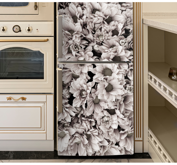 Transform your kitchen with our stunning Fridge sticker elegant floral design. This exquisite design features beautiful peonies and delicate flowers, all rendered in a striking black and white palette that brings a touch of nature indoors. The realistic floral art effortlessly enhances your refrigerator, creating an eye-catching focal point in your kitchen that radiates elegance and charm!