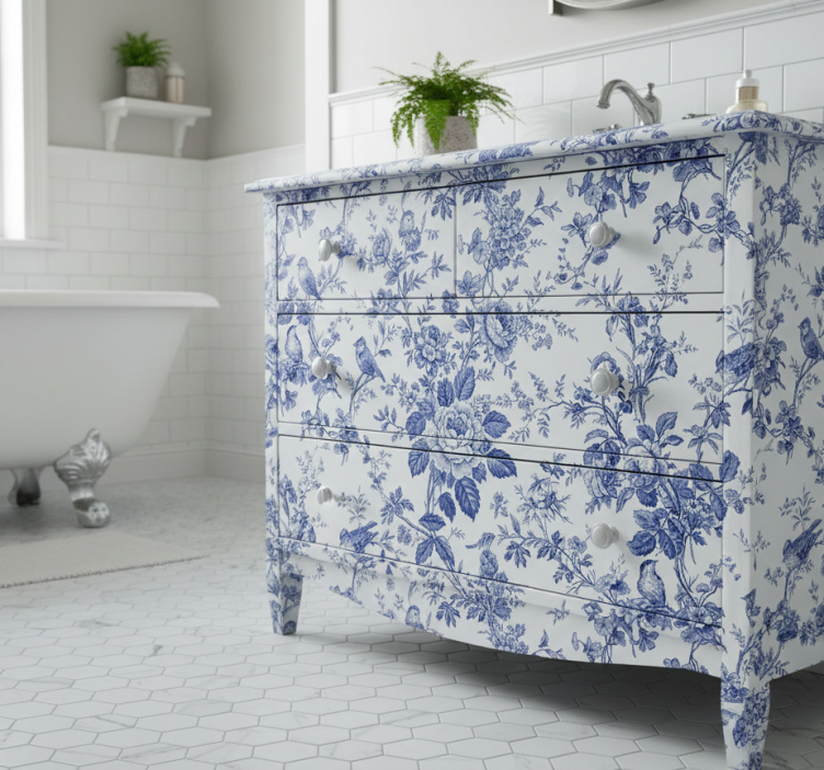 The Furniture sticker blue toile floral songbirds furniture sticker is more than just a decorative item; it's an expression of your personal style. Infuse your space with a touch of nature's beauty and elegance that inspires relaxation and joy! This sticker can easily enhance the ambiance of any room, making it a delightful choice for those who appreciate artistry in their decor.