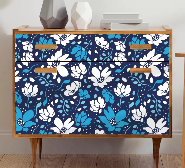 Transform your space with our Furniture sticker floral motif drawers, featuring an enchanting design of daisies, florals, and leaves. This beautiful pattern showcases a harmonious blend of blue and white flowers, bringing the essence of nature right into your home. The vibrant and delicate motifs create a refreshing atmosphere, making your furniture an eye-catching focal point!