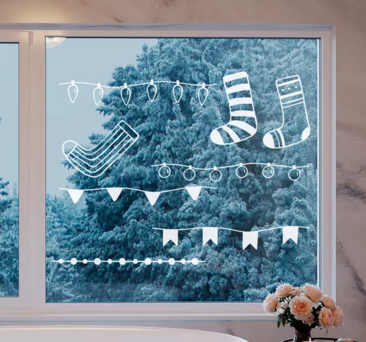 Brighten up your holiday season with our stunning Holiday sticker holiday sock display. This vibrant design features an enchanting array of stockings, Christmas ornaments, and festive garland, all beautifully illuminated by twinkling lights. Perfect for transforming your windows into a winter wonderland, this window sticker showcases charming socks and colorful banners that evoke the spirit of the holidays!