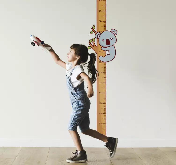 Easily keep track of your child's height progress with this well-calibrated height meter chart decal featuring a cute koala holding onto a tree. The design adds a playful touch to any space and encourages kids to measure themselves in relation to the koala's height.