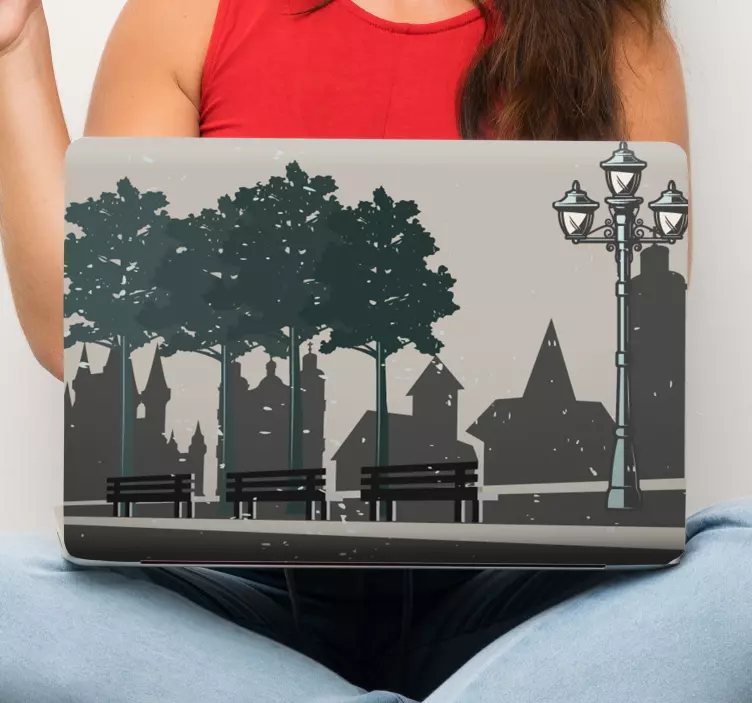 Transform your laptop into a visual masterpiece with our Laptop skin urban park landscape. This stunning design features a nostalgic 70's vibe, showcasing silhouettes of lamp posts, parks, and bustling streets, all beautifully intertwined with a vibrant cityscape, trees, and benches. Imagine the charm of an urban park brought to life on your laptop, serving as a delightful reminder of serene moments spent in nature!