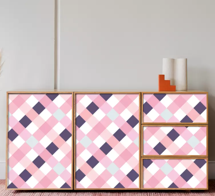 Introducing our stunning Object sticker pink patterned surface, designed with a captivating checkered pattern that brings a colorful, modern touch to your home decor! This geometric masterpiece showcases a delightful texture that can transform any piece of furniture, including drawers, into a vibrant focal point. Perfect for those who appreciate contemporary aesthetics, this product adds a playful yet stylish flair to your living space.
