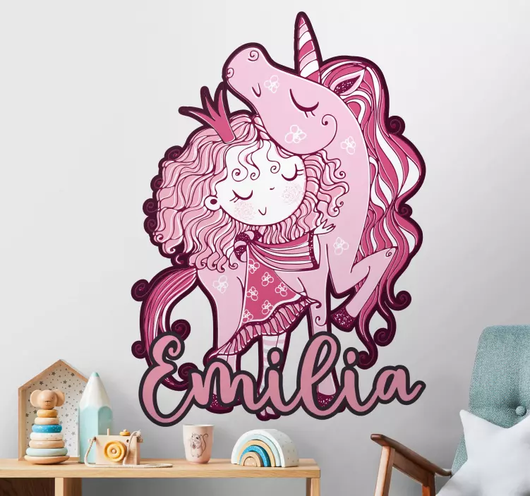 Transform your child's space with our Pink unicorn embrace wall sticker for kids, featuring a delightful design that perfectly blends the realms of fantasy and whimsy. This enchanting wall sticker showcases a charming cartoon princess alongside her magical unicorn, creating a vibrant atmosphere that sparks imagination. The customizable aspect allows your little one’s name to be incorporated, making it a truly unique addition to their room!