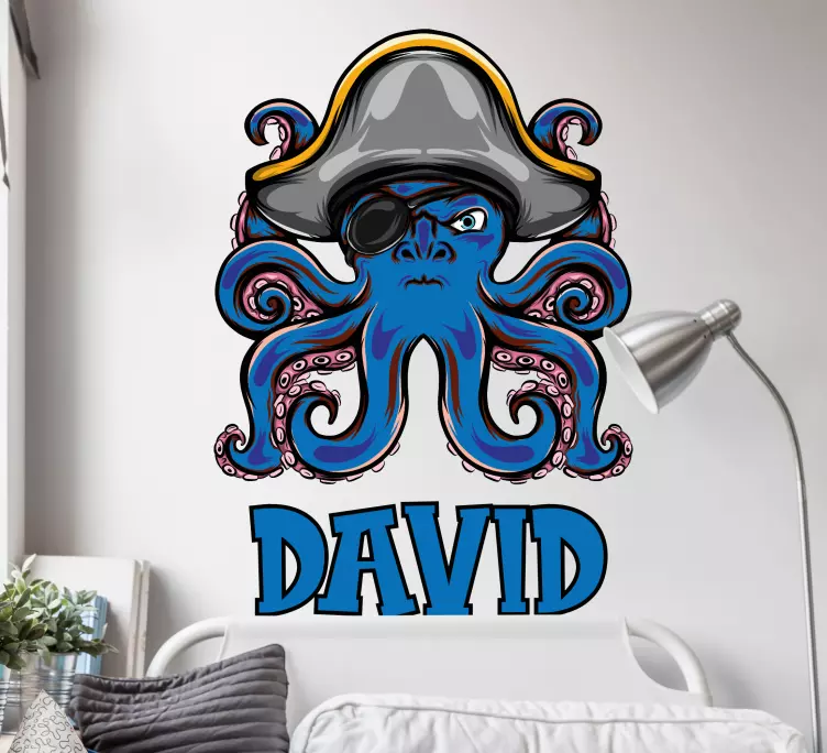 Introducing our enchanting Pirate octopus character sticker, a whimsical illustration that features a charming octopus donning a pirate hat and accessories. This delightful design is perfect for those looking to add a splash of personality to their space. With the option to include a custom name, this personalizable sticker brings a unique touch that can brighten up any room with its vibrant blue colors!