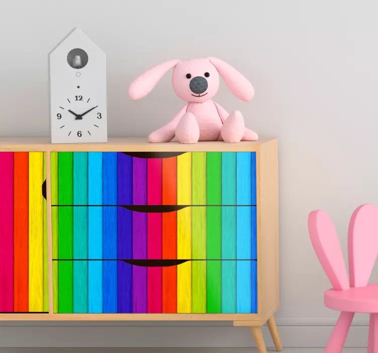 The Shape sticker in bright vertical stripes is a vibrant and dynamic design that features an array of colorful stripes reminiscent of a rainbow. This abstract pattern combines a wood-effect finish and planks that create a unique visual appeal, perfect for enhancing your furniture and adding a multicolor touch to any space. The lively hues and striking design will undoubtedly brighten up your surroundings!