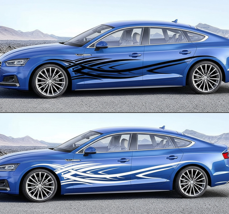 The image features a sleek vehicle adorned with bold, curving graphics that enhance its dynamic appearance. The flowing lines create a sense of motion, perfect for those wanting to personalize their ride. This design expresses individuality and style, making an impactful statement on the road.