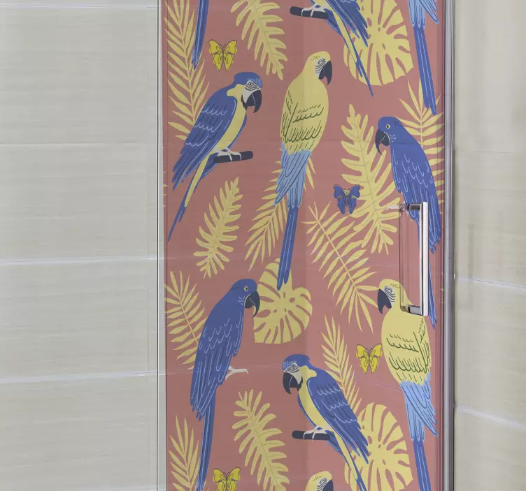 Transform your bathroom into a vibrant oasis with our Shower screen sticker colorful parrots pattern. This stunning design features eye-catching macaws and butterflies gracefully perched among lush, leafy foliage, creating a tropical paradise right on your shower door. The bright yellow and blue hues bring nature indoors, inviting a cheerful ambiance that revitalizes your space. Experience the beauty of nature every time you step into your shower!