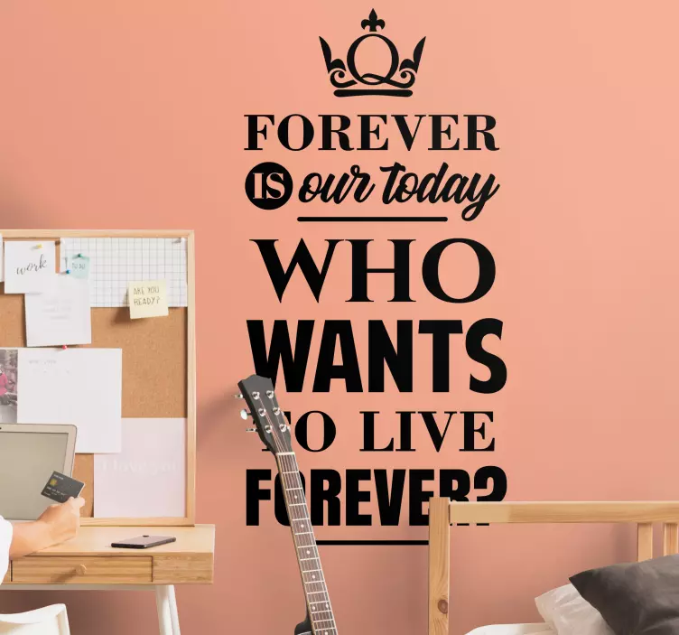 Introducing our stunning Wall decal quotes who wants to live forever, designed with a beautiful monochrome typography that captures the essence of music and inspiration. The lyrics of the song come alive through this artistic text, making it a perfect decorative piece for those who believe in the power of music to inspire and motivate. This wall decal is not just a piece of art; it's a statement of living life to the fullest and cherishing every moment!