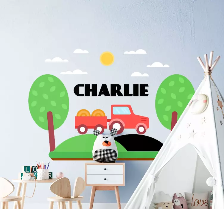 Transform your child's space with our stunning Wall sticker for kids custom truck scene. This delightful design features a charming tractor and truck amidst a picturesque farm setting, complete with lush greenery, trees, and a bright sun. The customizable nature of this sticker allows you to personalize it to fit your child's unique style, making it a perfect addition to any playroom or bedroom. It sparks imagination and joy, creating a playful atmosphere that your little ones will adore!
